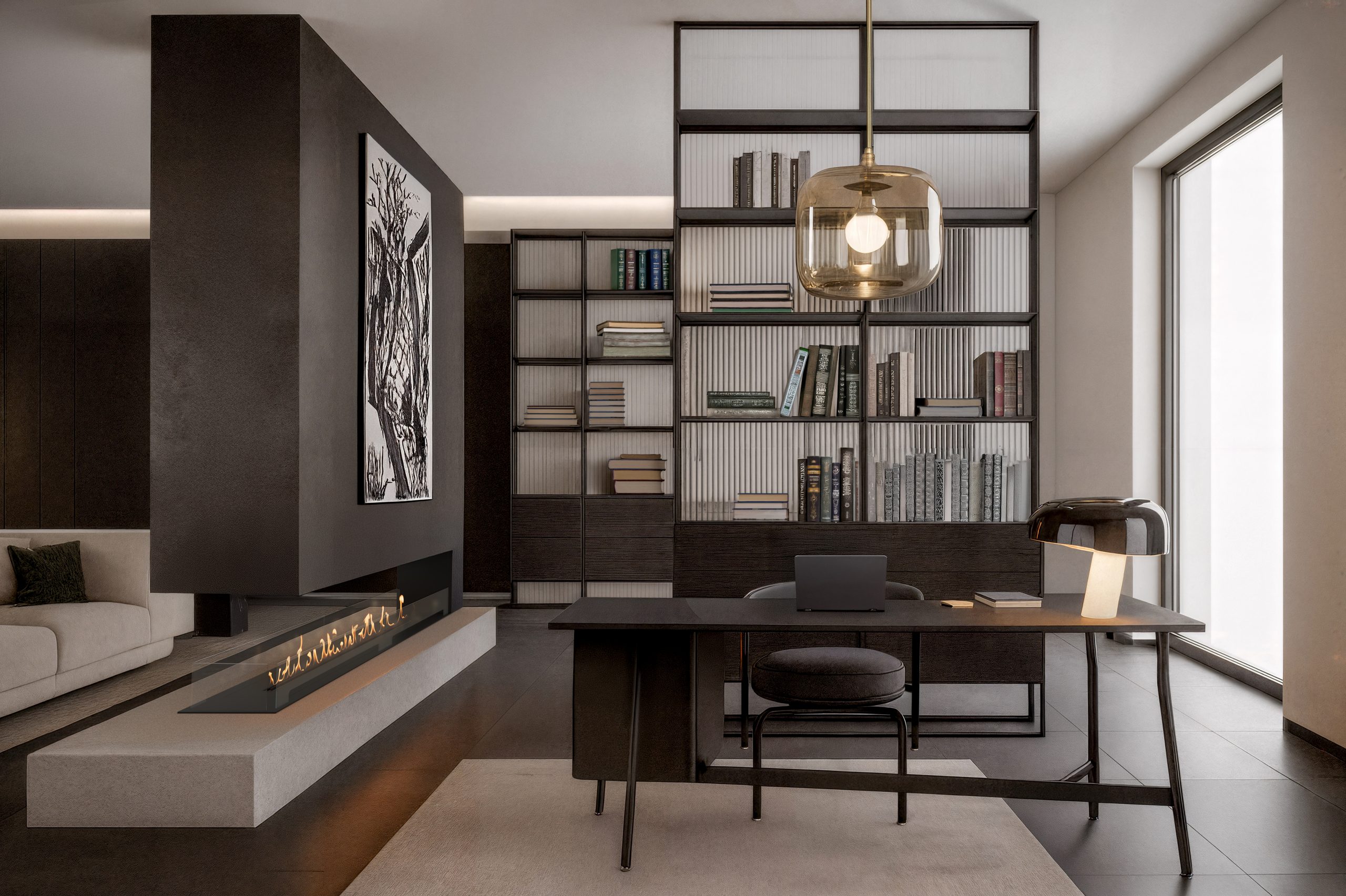 Mechanical refinement appears in intuitive screen-height adjustments tailored to viewing comfort. The system is fully configurable, allowing bespoke cladding, layout, and fire type.