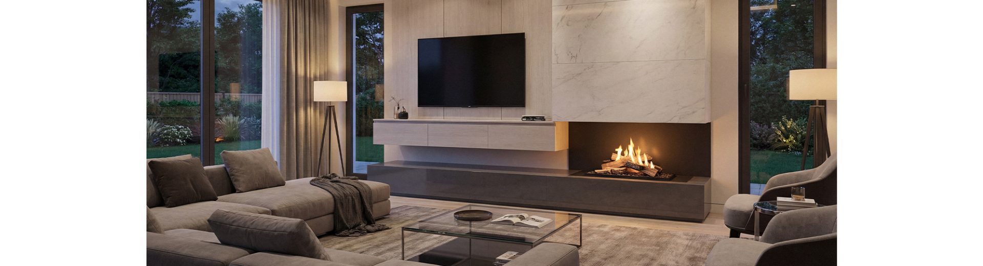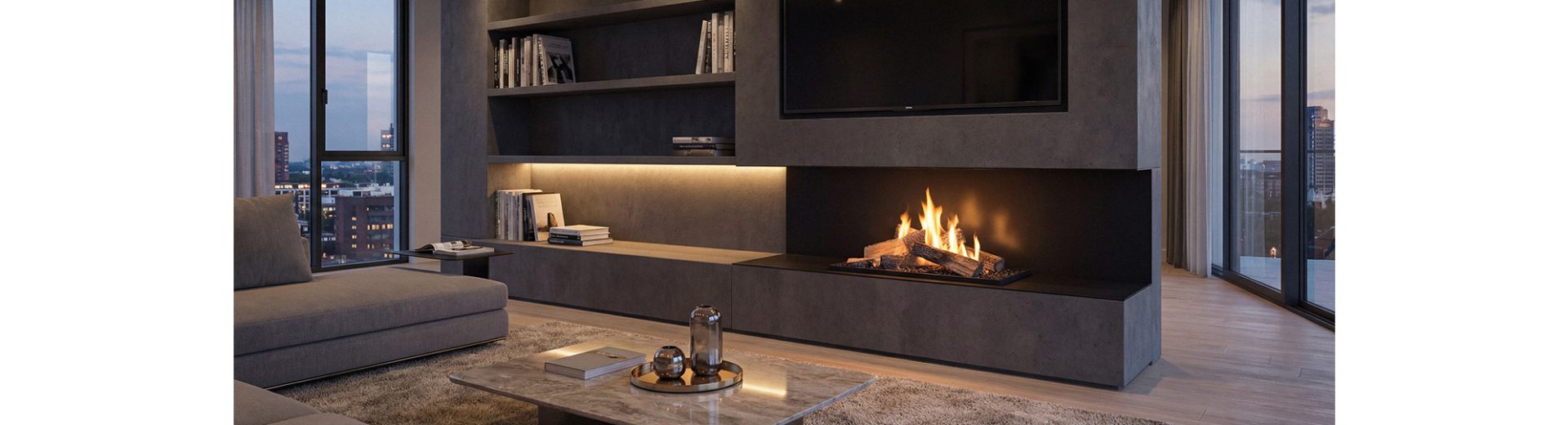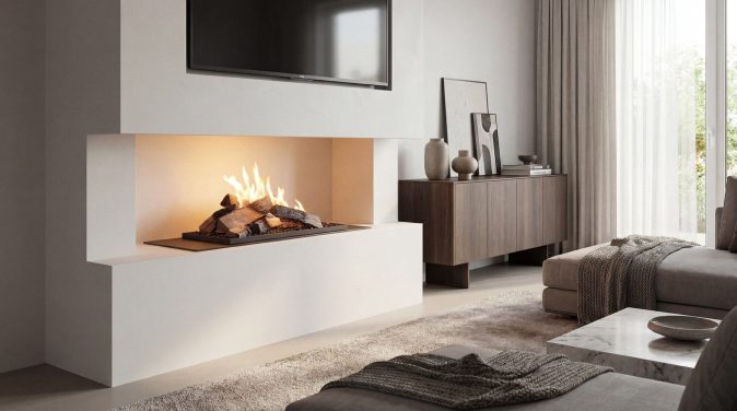 Discover Forma — a ready-made fireplace enclosure that allows the safe use of combustible finishing materials and eliminates the need to recess the TV into the wall, offering greater freedom in interior design.