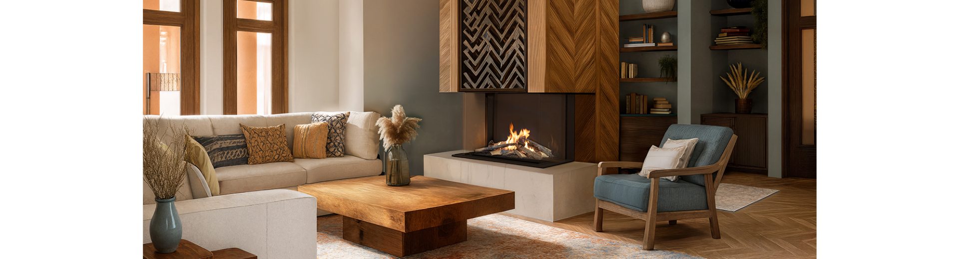 The Sono fireplace features a specially designed BEV® burner with a realistic arrangement of ceramic logs. These are arranged in layers and at various angles, creating the effect of a fire burning deeper, not just in a straight line. The flame has an irregular structure, variable height, and a natural rhythm – making it closer to the hearth than typical linear fireplaces. This design enhances the visual impact of the space, especially in designs where the fire serves as a focal point.
